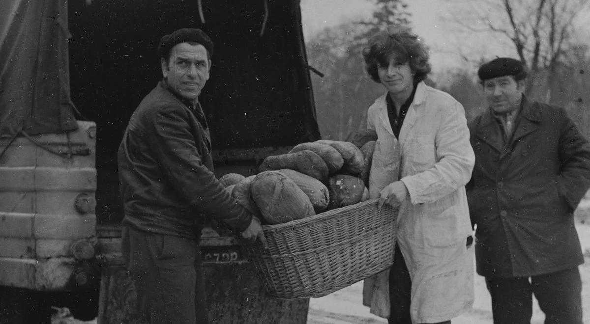 Transport chleba do sklepu - wyładunek z samochodu Żuk, grudzień 1973 roku